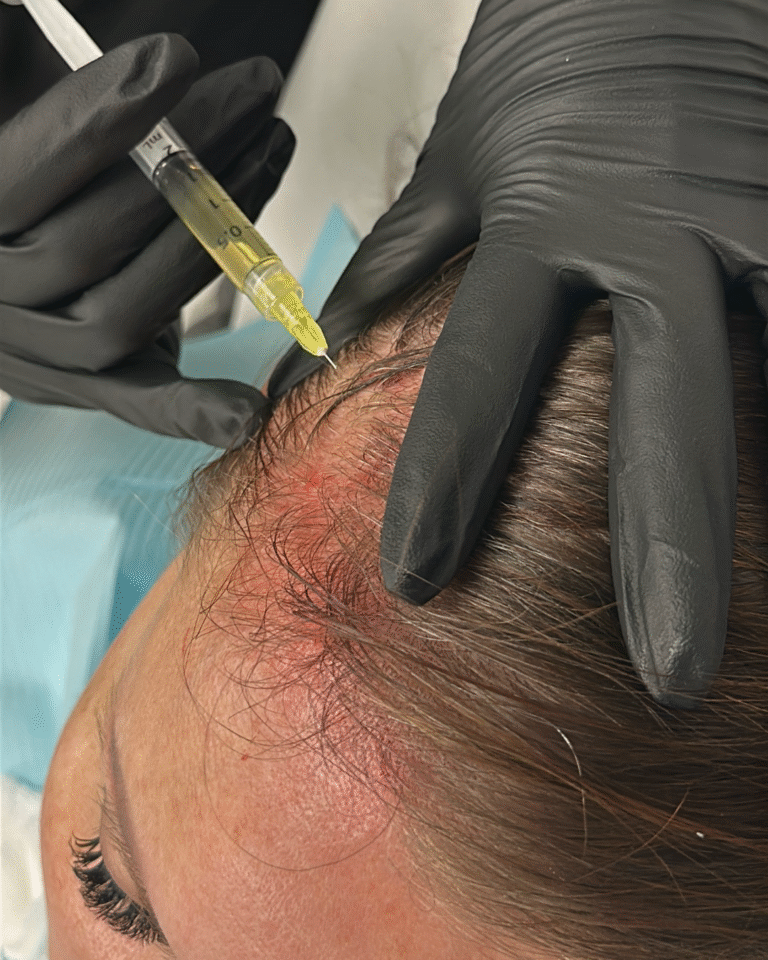 A small sample of your blood is taken and placed in a centrifuge to separate out the rich plasma or fibrin. This golden serum — packed with growth factors — is then microneedled or injected into targeted areas of the skin or scalp.