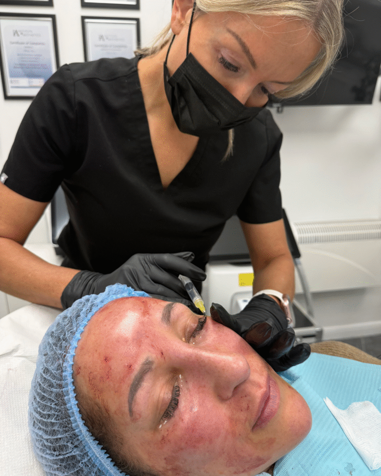 Downtime is minimal. You may experience some redness, swelling, or tiny bruises for a day or two, especially if microneedling is used.